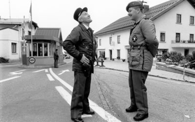 On the web site of Milken Institute Review from April 17, 2017, a picture about laughing customs officers at the he border between Switzerland and France.